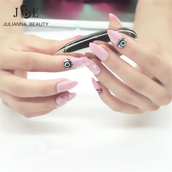 Cute Eyes Pink Color Oval Stiletto Pointy Full False Nail Tips Almond Shape Acrylic Gel Claw Fashion Nail Tips With Glue French Nails Nails Design