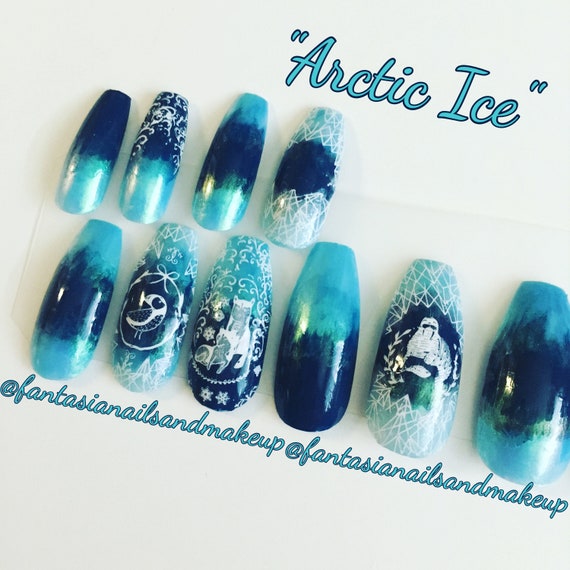 Blue Ice Winter Nails Holiday Christmas Nails Crystals Snow Nails Fake Coffin Nails Press On Nails Glue On Nails False Nails