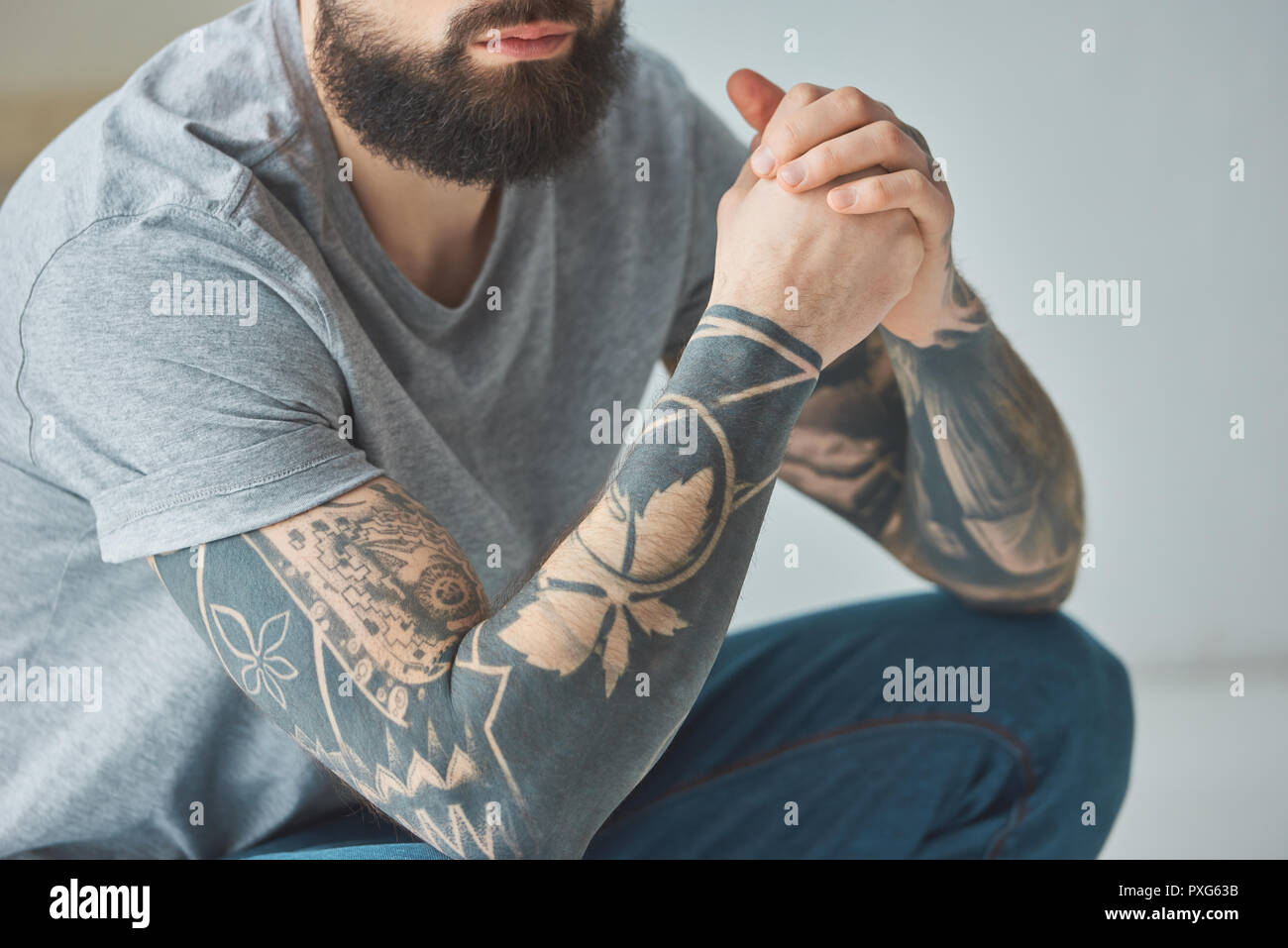 Cropped Shot Of Bearded Man With Tattoos In Grey Tshirt
