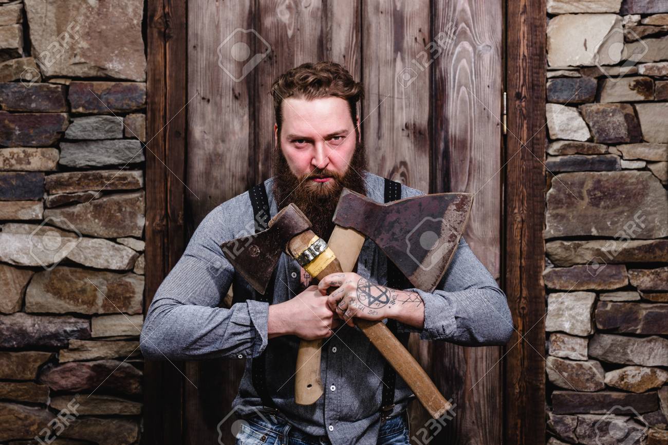 Strong Brutal Man With A Beard And Tattoos On His Hands Dressed