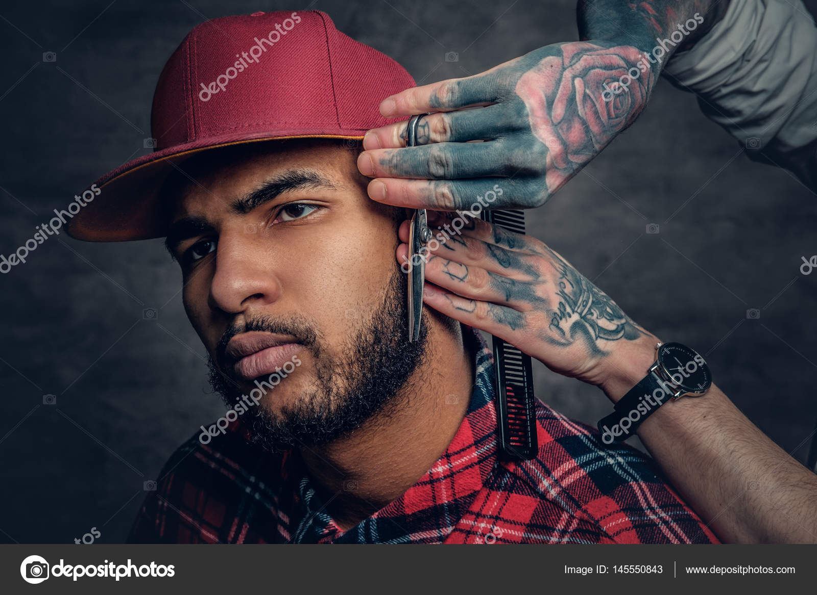 Tattooed Barber Cutting The Beard Stock Photo C Fxquadro