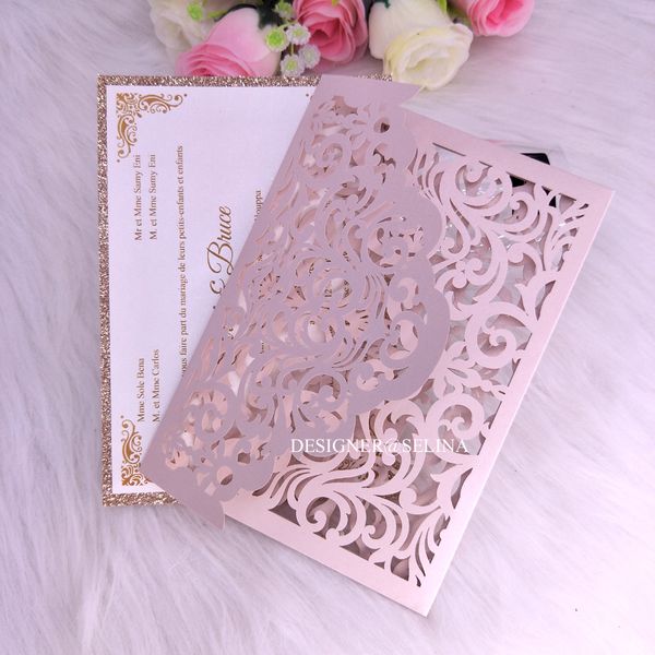 Cordially Inviting Rose Gold Glitter Bottom Wedding Invitations Blush Pink Full Laser Cut Invitation For Quinceanera Evening Invites Wedding