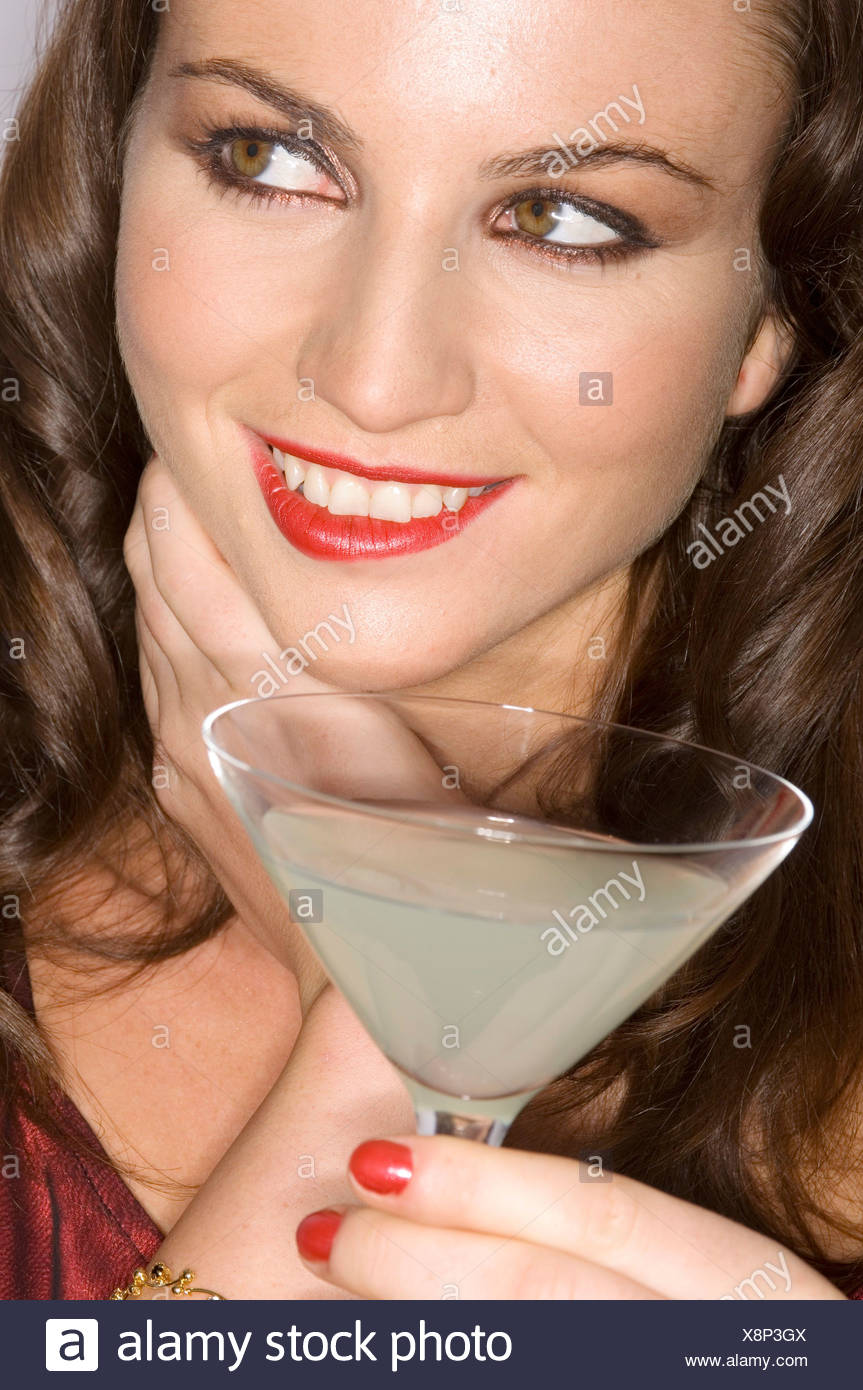 Female Long Wavy Brunette Hair Wearing Maroon Red Dress