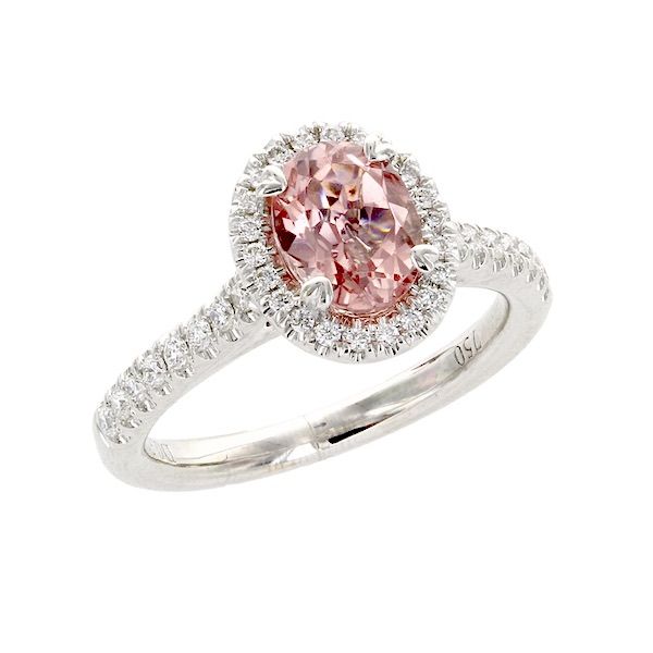 18 Karat White Gold Peachy Pink Oval Morganite Halo Diamond Ring