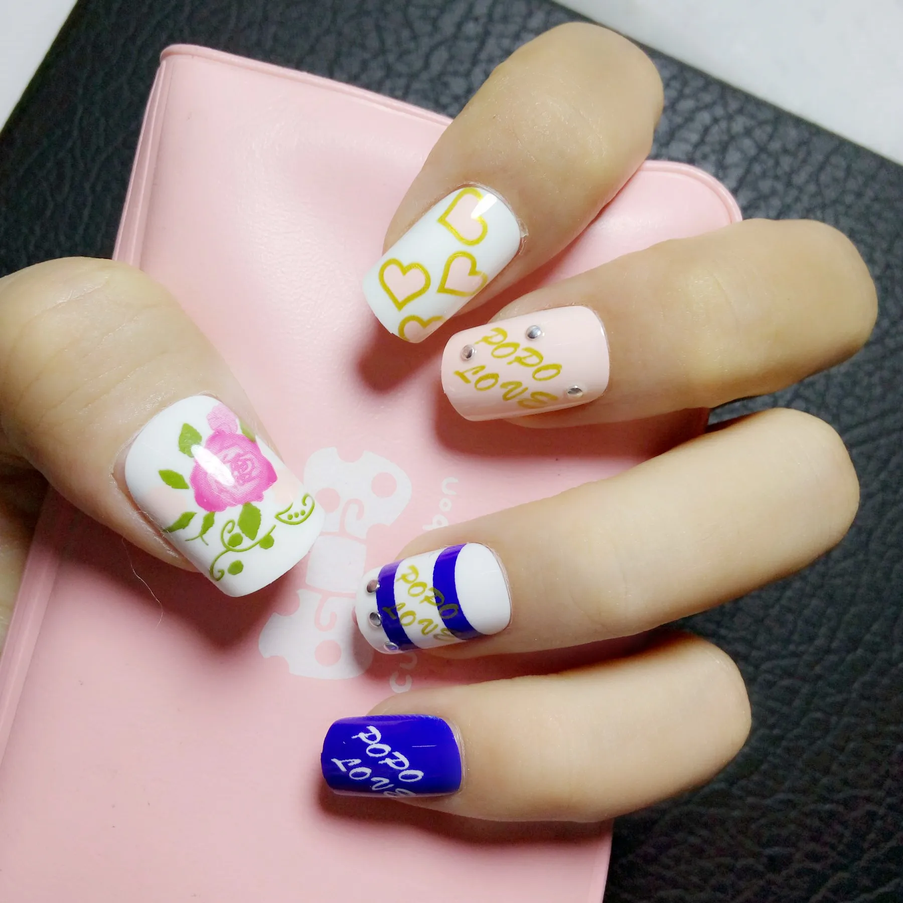 Us 2 9 15 Off Shiny Fake Nails Royal Blue Natural Pink False Nails Acrylic Full Cover Nails Tips Heart Rose Pattern Manicure Tools Z110 In False