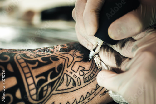 Master Tattoo Artist In Gloves Makes Tattoo On Hand Men