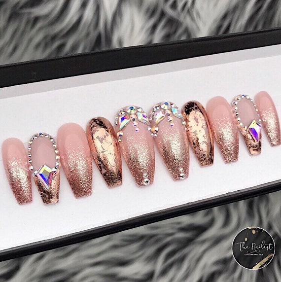 Rose Gold Bahamas Soph Pink Nude And Rose Gold Foil Ombre With Bling Crystals Press On Nails Any Shape Fake Nails False Nails Glue