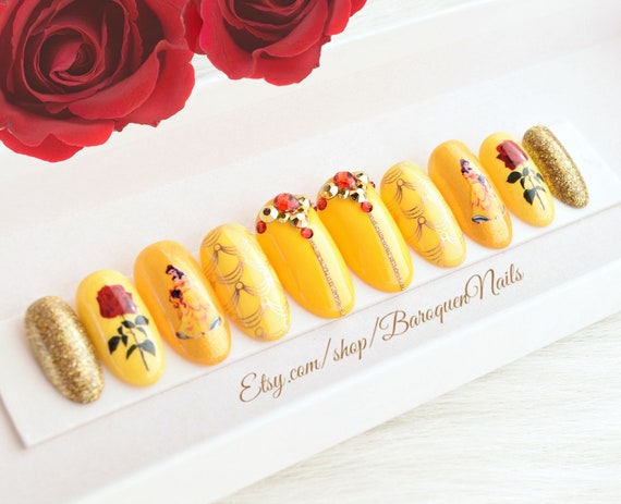 Belle Yellow Nails Beauty The Beast Inspired Press On Nails Princess Gold Ruffle Design Ball Gown Nail Art Red Rose Fake Nails Sparkle