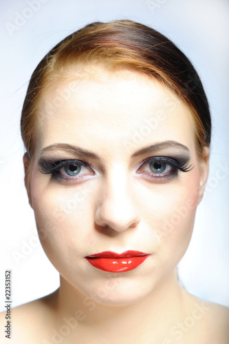 Beauty Female Face With Red Shiny Lips And Black Eye Makeup