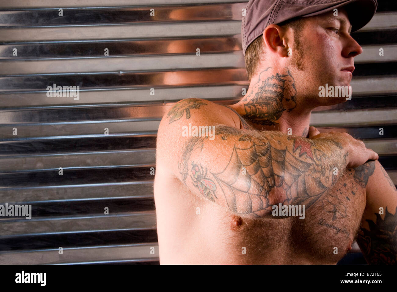 Young Man With Tattoo Design On Upper Body Stock Photo