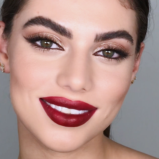 Glittery Rose Gold Eyes Matte Red Lips Holiday Glam