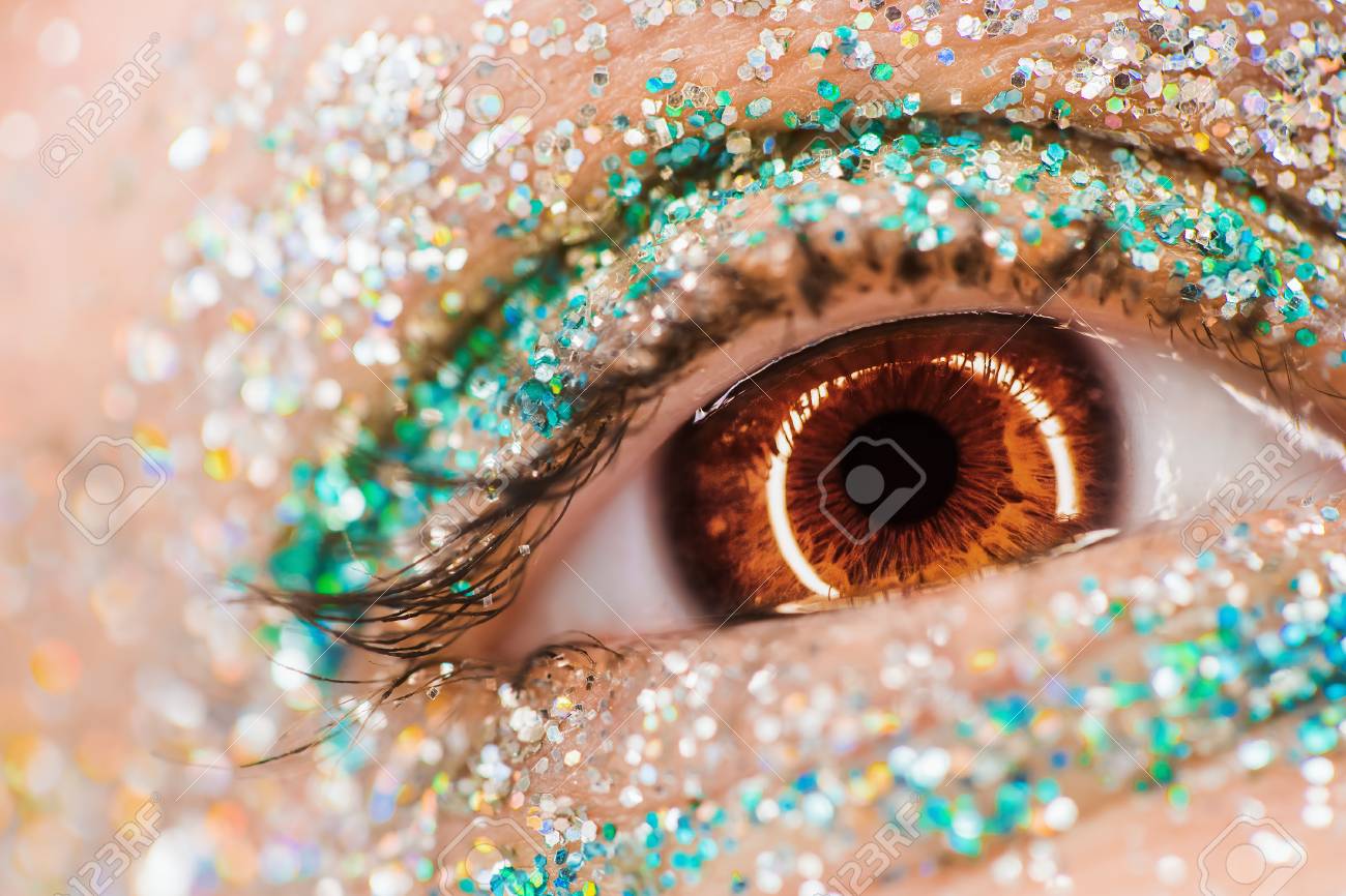 Macro Brown Female Eye With Glitter Eyeshadow Colorful Sparks