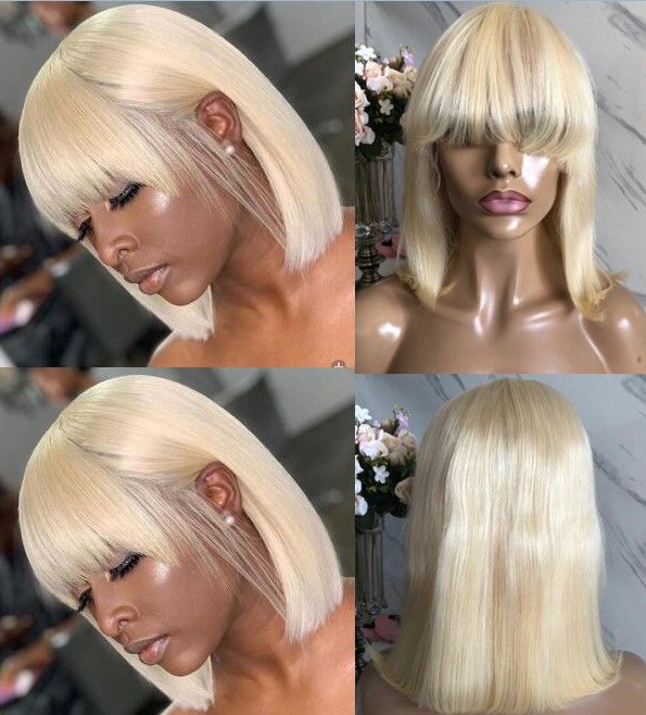 Short Bob Cut Lace Front Wig With Bang 613 Blonde Color Indian Virgin Human Hair Full Lace Wig For Black Woman Curly Human Hair Full Glueless Lace
