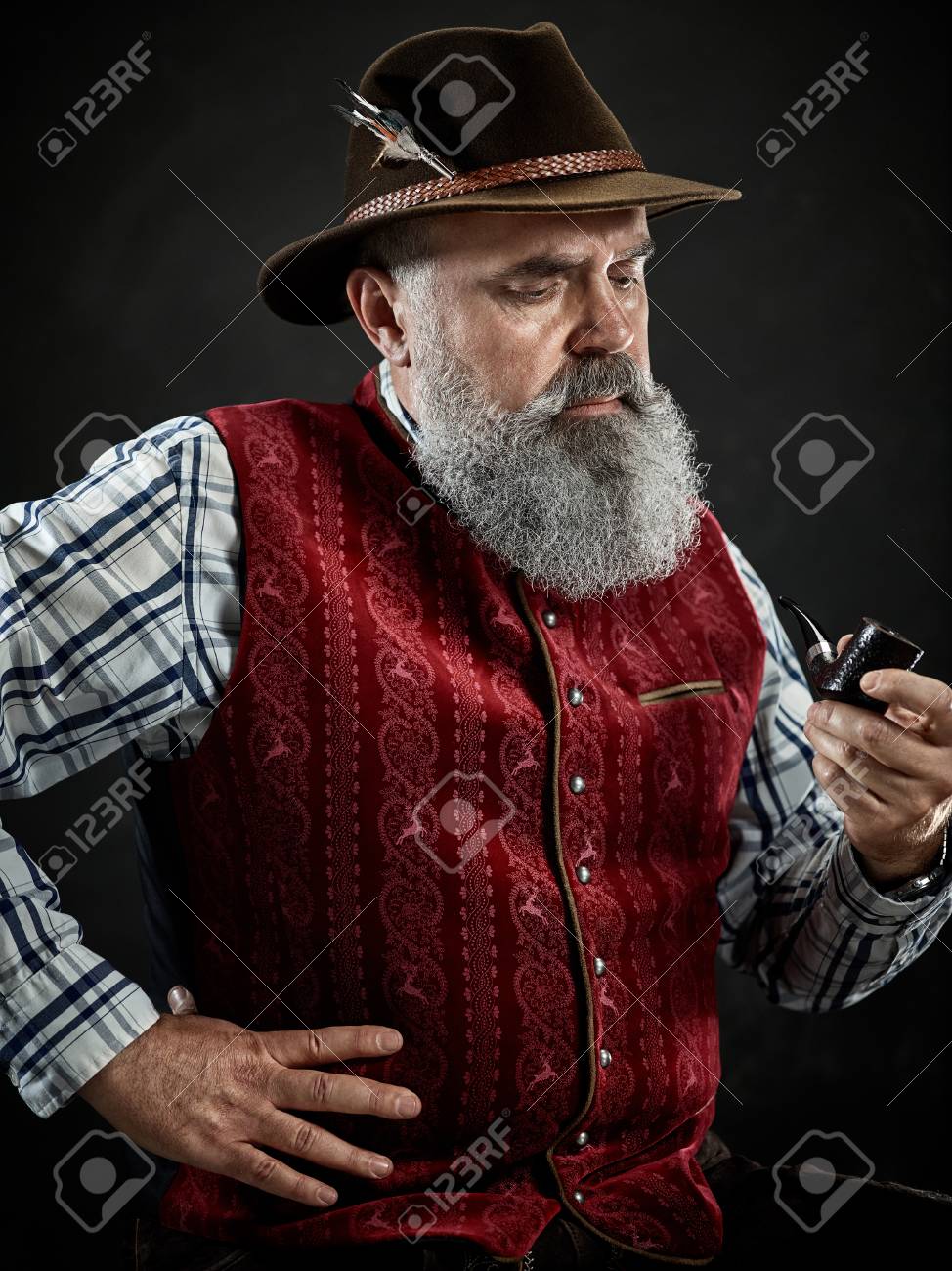 Dramatic Portrait Of Gray Bearded Senior Man In Hat Smoking Tobacco