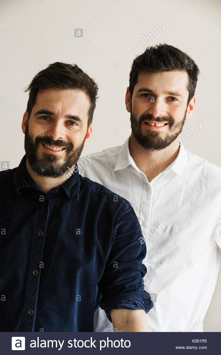 Portrait Of Two Bearded Men Smiling At The Camera Stock