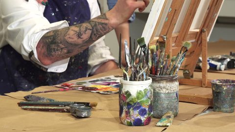 Sliding Shot Of A Handsome Tattooed Bearded Young Male Artist Enjoying Painting A Picture At The Art Studio Woth His Beautiful Happy Girlfriend Hugging Him Support Happiness Love Dating Romantic