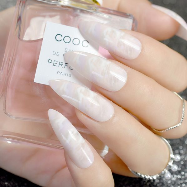 White Jade Marble Shell Stiletto False Nail Extra Long Sharp White Pink Stone Texture Fake Nails Faux Ongles Acrylic Nails Tips False Nails Designs