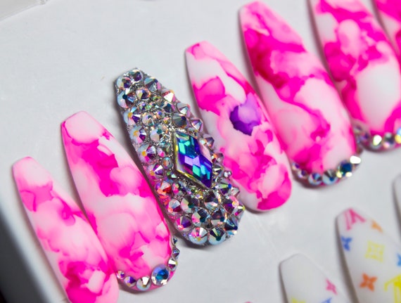 Pink Marbled Bling Press On Nails Acrylic Nails Nail Art Fake Nails Glitter Nails Blingy Nails Handmade Gift For Her Swarovski Nails