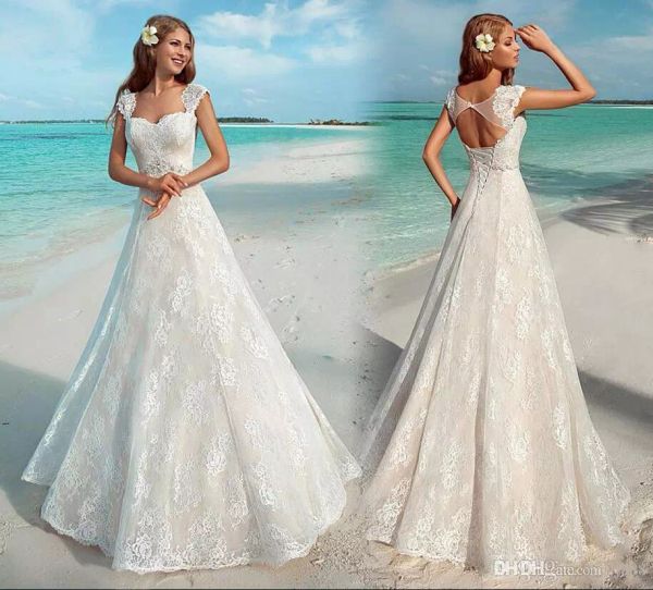Discount New Elegant Summer Beach Wedding Dresses Vintage Full Lace Cap Sleeve Sexy Open Back Lace Up Bridal Gowns Cheap Custom Made A Line Wedding