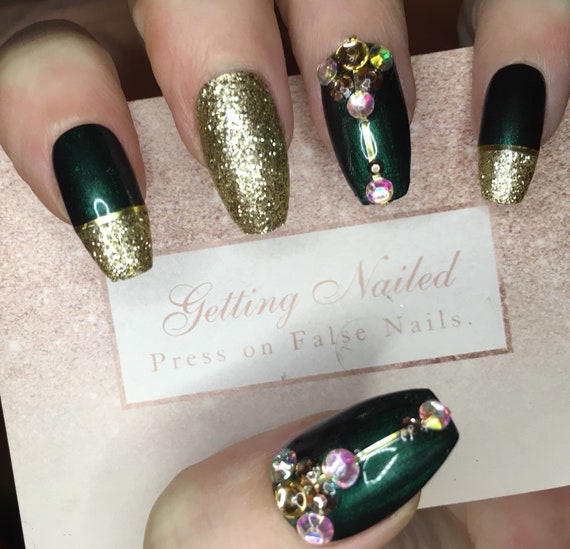 Fale Nails Green False Nails Green Gold Nails False Nail Set Green Fake Nails Bridal False Nails Prom False Nails Occassion False Nai