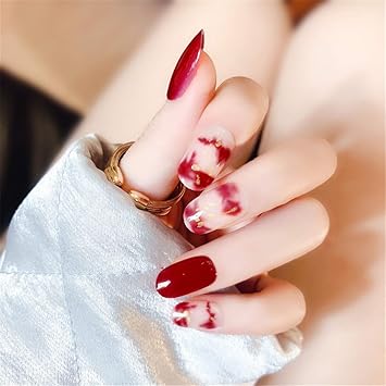 24pcs Cherry Red False Nails Full Cover Artificial Gold Foil