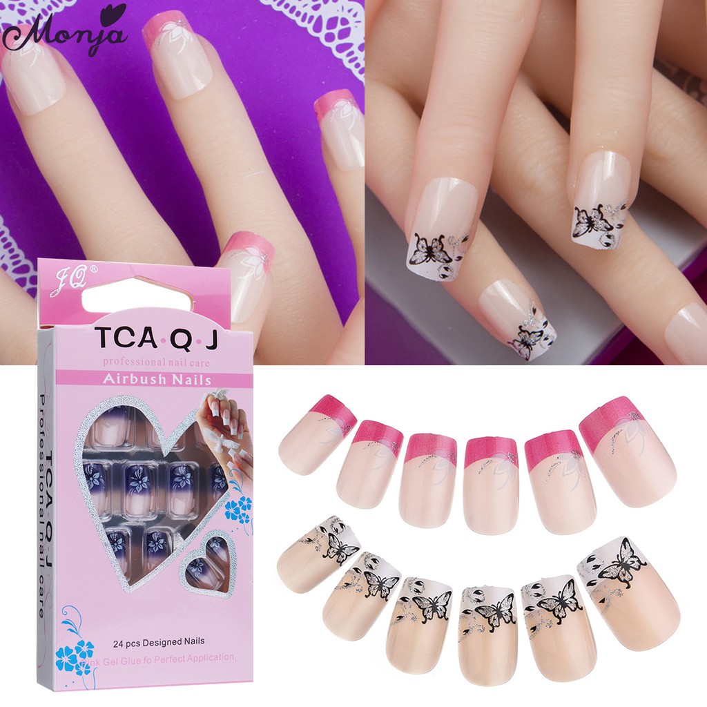 24pcs French False Nail Art Tips Flower Natural Clear Press On Full Cover Acrylic Fake Fingernail Tips