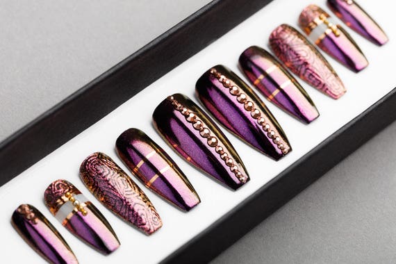 Erstaunliche Lila Falsche Nagel Rosegold Rhinestones Handgemalte Nail Art Falsche Nagel Kleber Auf Nagel