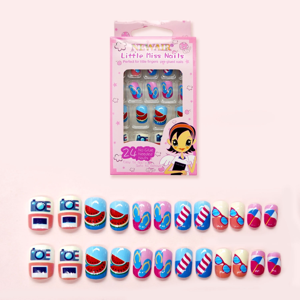 24pcs Press On Children Beach False Nail Tips Cartoon Short Fake Nails Art Women Kids Acrylic Design Blue Ocean Patterns