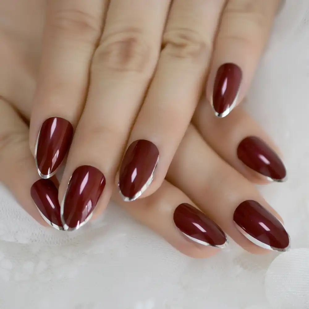 Burgundy Nail Art Metallic Silver French Stilettos False